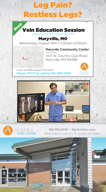 Join us for a FREE Vein Education Session about Varicose Veins presented by Dr. Sam Gupta at the Maryville Community Center in Maryville, MO. Learn about varicose vein signs & symptoms, including restless legs, leg pain, leg cramps, discolored skin, sores, including the latest treatment options available that are covered by insurance. Free snacks and beverages will be provided.