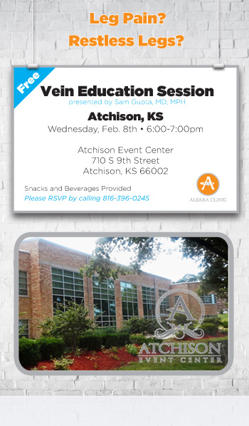 Join us for February's Vein Education Session about Varicose Veins presented by Dr. Sam Gupta at the Atchison Event Center in Atchison, KS. Snacks and beverages will be provided.