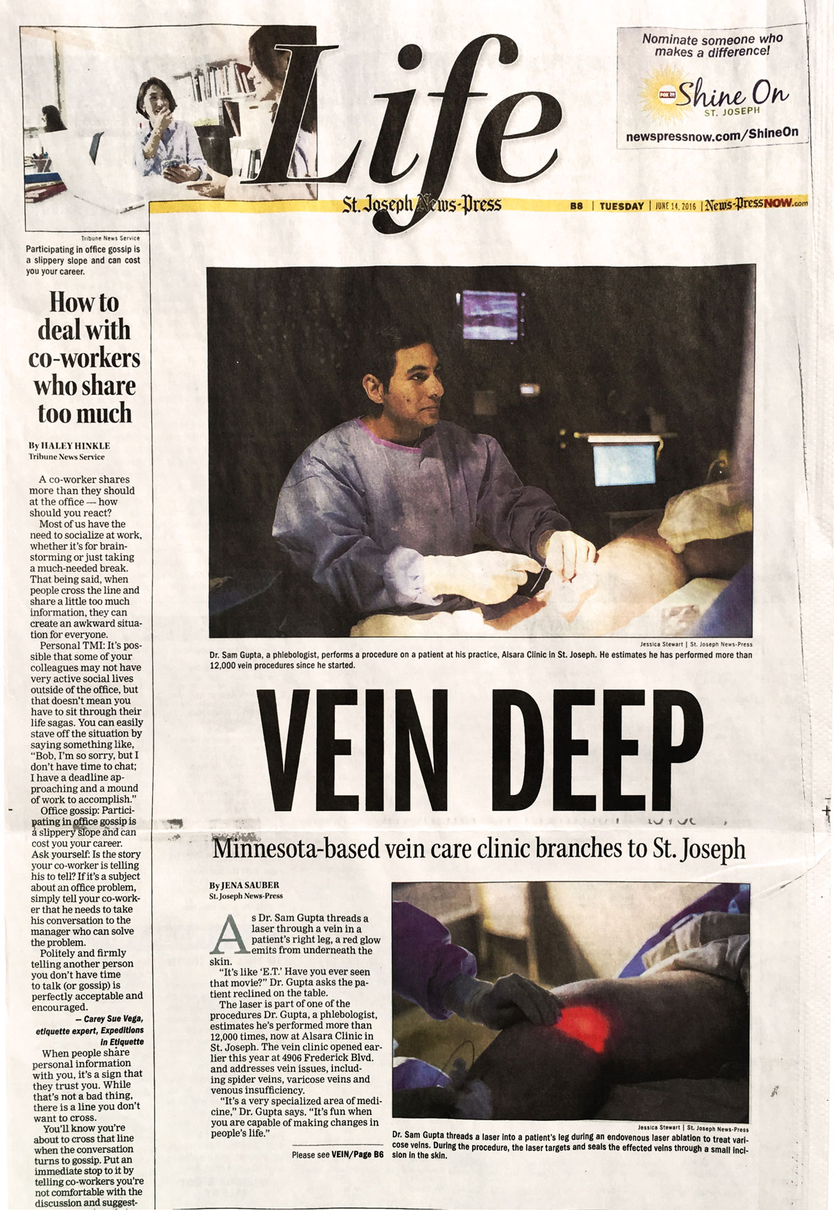 Dr. Sam Gupta from Alsara Clinic was featured in a news article in St. Joseph News-Press discussing how laser technology allows for rapid, long term treatment of varicose veins, spider veins and venous insufficiency.